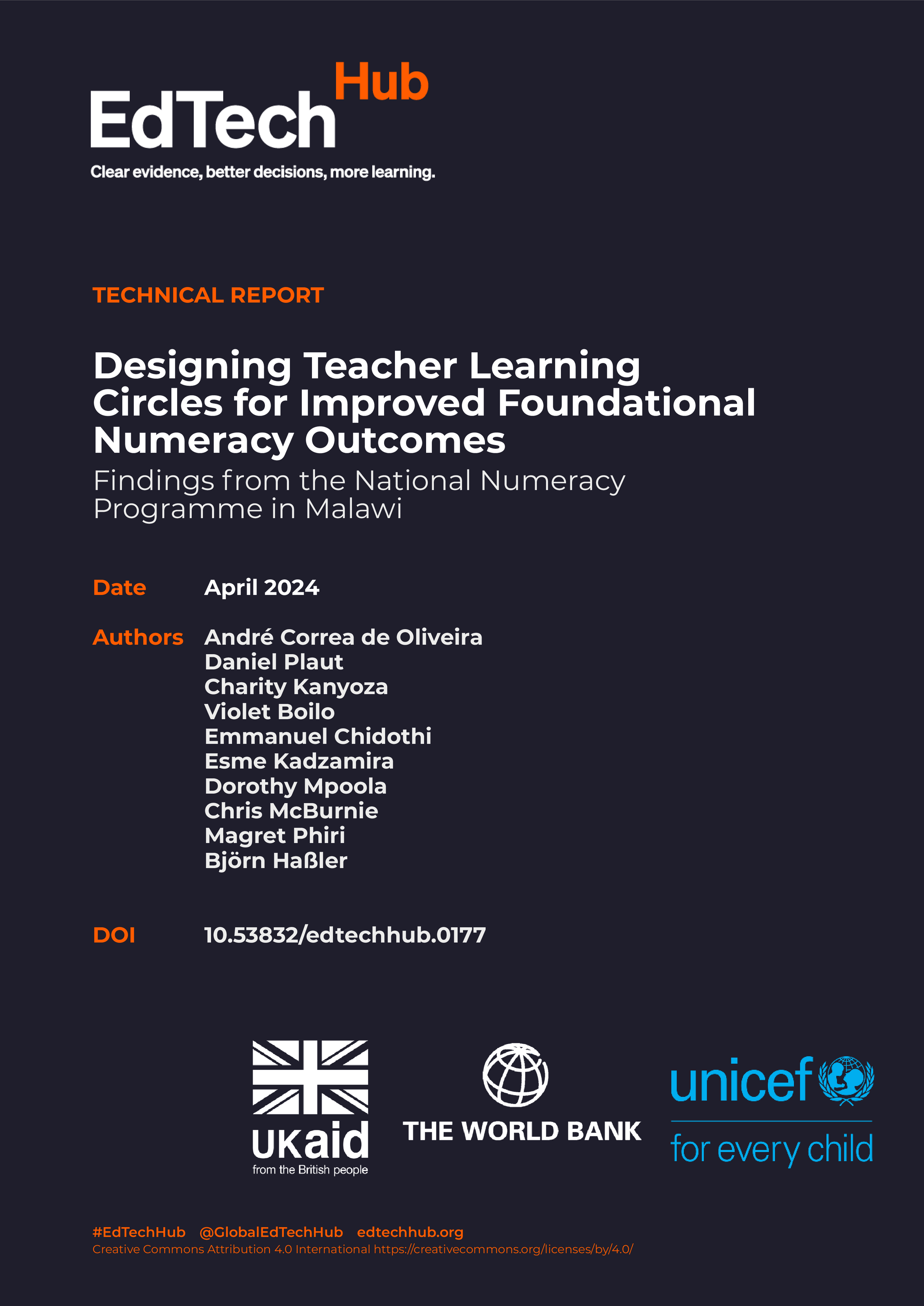 The Malawi National Numeracy Programme (NNP) was designed in 2020 in partnership with the Malawi Ministry of Education and Cambridge Education (Mott McDonald), funded by the UK Foreign, Commonwealth and Development Office (FCDO). Building on findings from a prior qualitative review of the NNP's programme components, EdTech Hub proposed a new phase of design-based implementation research (DBIR) to be undertaken in Term 2 of the 2022–2023 school year to refine the school-based teacher continuous professional development (TCPD) model of the NNP. As part of the research, EdTech Hub developed a new TLC guide to be tested in schools. Through observations, focus group discussions, and interviews, the Hub gathered teacher feedback and used it to co-design and iterate on this guide alongside teachers. This report summarises the principal findings from the study. It also outlines the research background, methodology, findings, and recommendations for the programme moving forward. Keywords: teacher continuous professional development, teacher learning circles, National Numeracy Programme (NNP), Malawi, design-based implementation research An output of the EdTech Hub, https://edtechhub.org