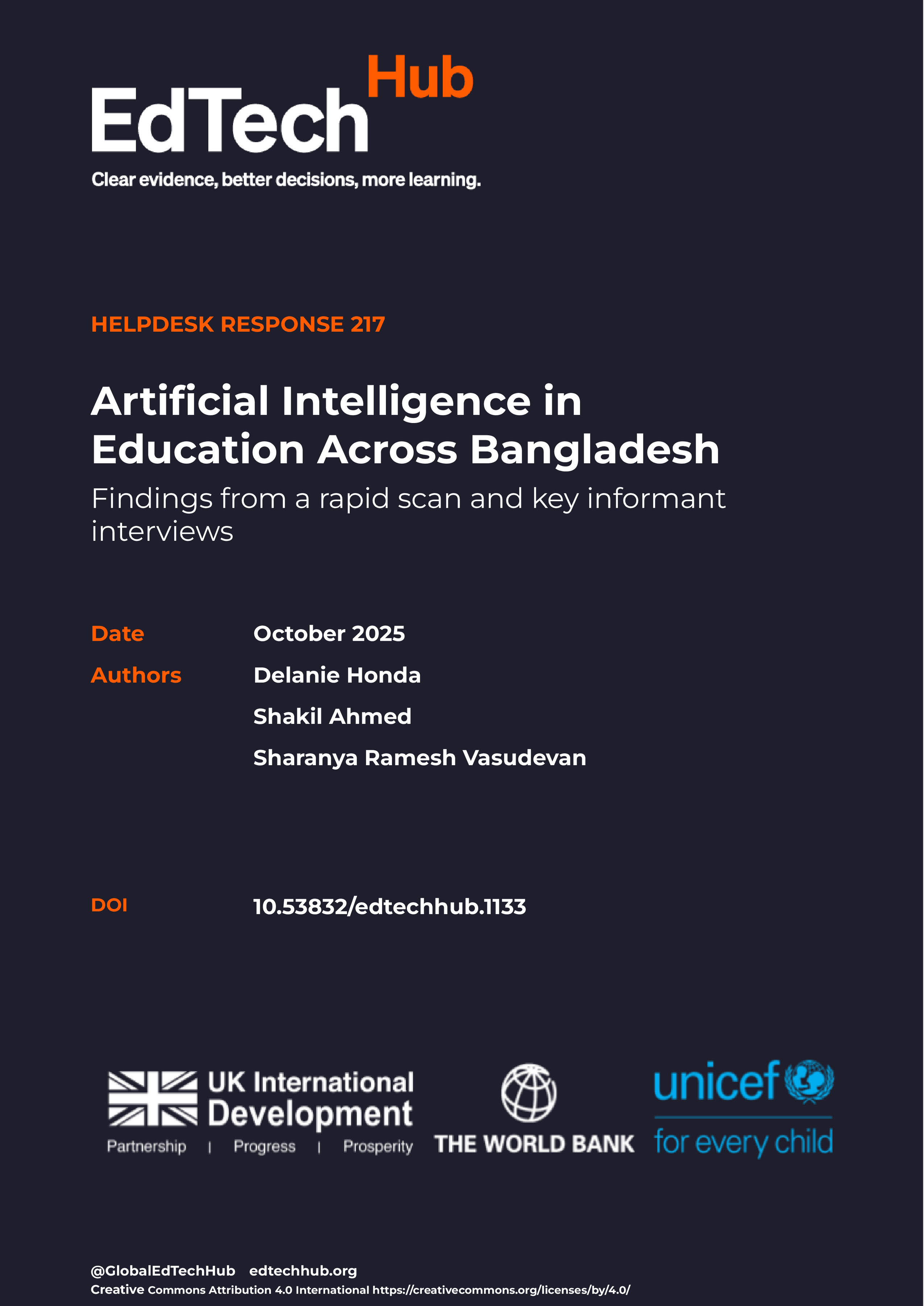This Helpdesk Report was developed in response to a request from the UK's Foreign Commonwealth and Development Office (FCDO) Bangladesh for a rapid scan on the use of Artificial Intelligence (AI) in Bangladesh’s education system. The report aims to provide education decision-makers with accessible, evidence-based summaries of best practices in specific areas of EdTech, in this case, the AI landscape in Bangladesh. Using a combination of desk research and key informant interviews, the scan provides insights for the FCDO by highlighting key actors, early use cases, opportunities, and challenges, and to support future thinking about AI’s role in education, particularly as Bangladesh is preparing for its next development education plan — the Primary Education Sub-Sector Programme. An output of the EdTech Hub, https://edtechhub.org/