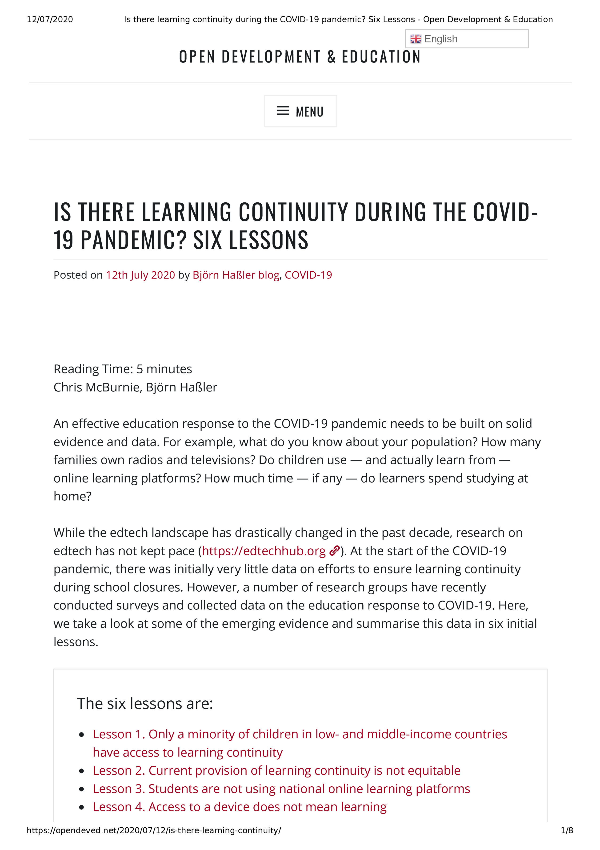 Is there learning continuity during the COVID-19 pandemic? Six Lessons