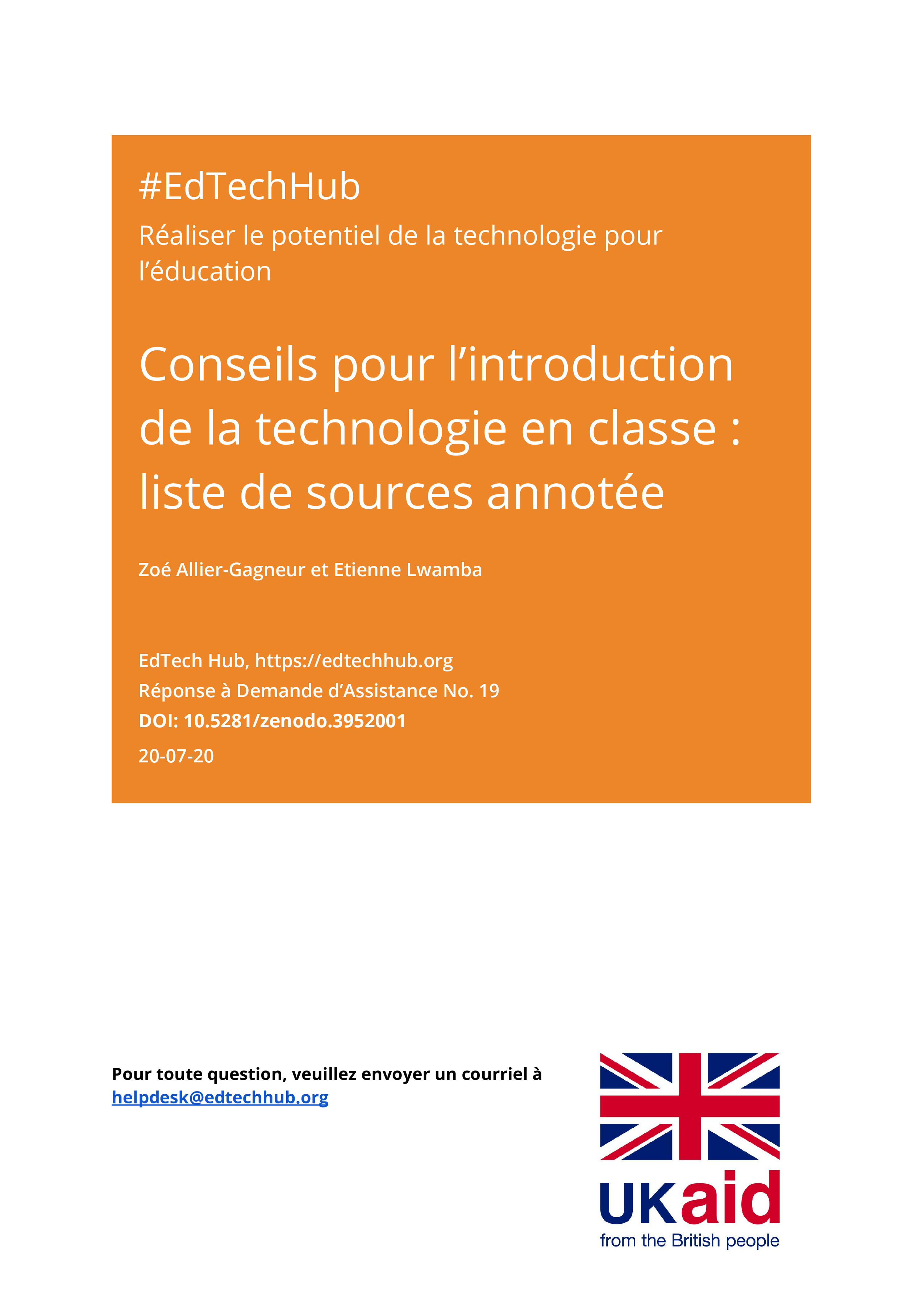 Cette liste de sources annotée a pour but d’informer la prise de décisions des acteurs du domaine de l’éducation concernant l’introduction de technologies en classe dans les pays à revenu faible et intermédiaire. Cette liste est une introduction qui expose de façon informelle certains des conseils généraux que prodiguent souvent les experts de l’EdTech Hub.