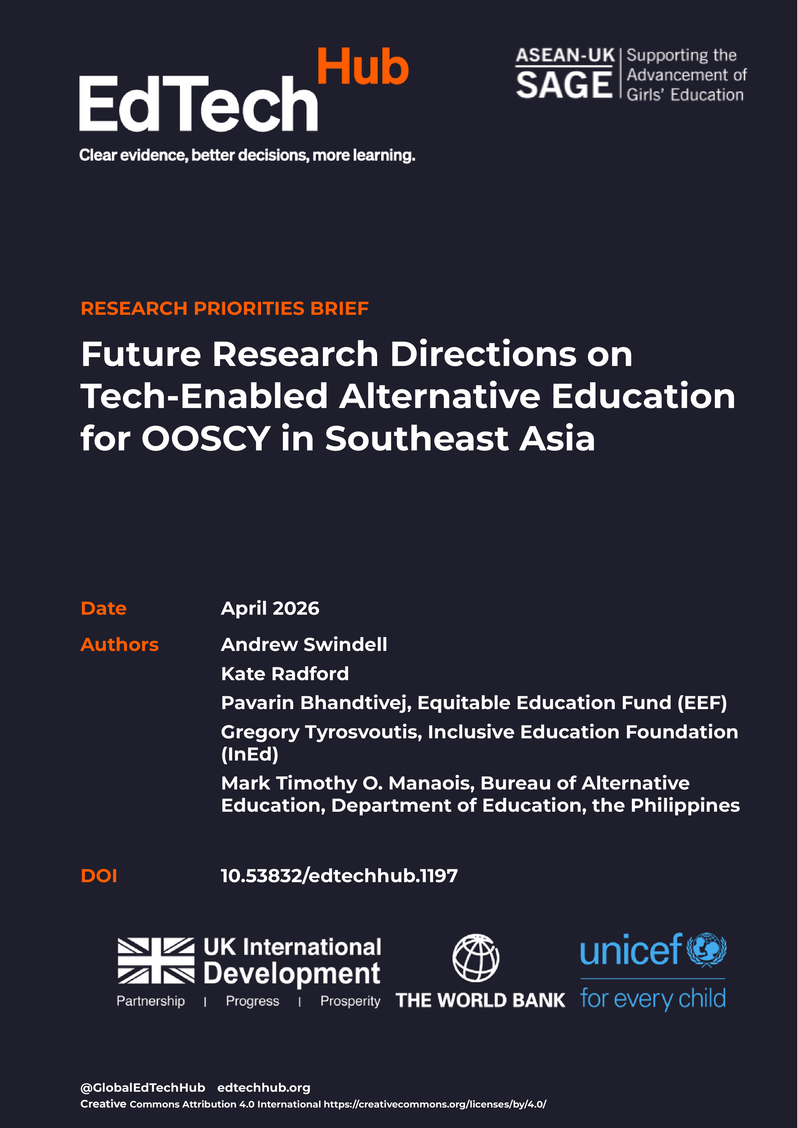 This brief outlines future research directions on tech-enabled alternative education for out-of-school children and youth (OOSCY) in Southeast Asia, building on a regional study and participatory workshop conducted by EdTech Hub in early 2026 (see related items). Drawing on evidence gathered across Cambodia, Indonesia, Thailand, and the Philippines, the brief identifies four regional research priorities: 1) generating quantitative evidence on learning outcomes across tech-enabled approaches; 2) strengthening longitudinal evidence on completion pathways and learner motivation; 3) building the economic case for financial sustainability and return on investment; and 4) examining EdTech effectiveness and protection risks in emergency and fragile contexts. The brief also presents nine programme-specific priorities from Thailand's Inclusive Education Foundation (InEd) and the Philippines' Alternative Learning System (ALS), covering areas such as educational access for OOSCY in border communities, digital equity in last-mile settings, real-time data monitoring, gamification, learning modality effectiveness, implementer digital literacy, computer-based assessment feasibility, digital citizenship integration, and ICT infrastructure financing. Together, these priorities address critical evidence gaps that currently limit informed policymaking and programme development. The brief is intended to guide future research investments and regional collaboration in support of more equitable and sustainable education opportunities for OOSCY across Southeast Asia. Keywords: out-of-school children and youth (OOSCY); alternative education; educational technology (EdTech); Southeast Asia; digital equity; migration An output of the EdTech Hub, https://edtechhub.org/