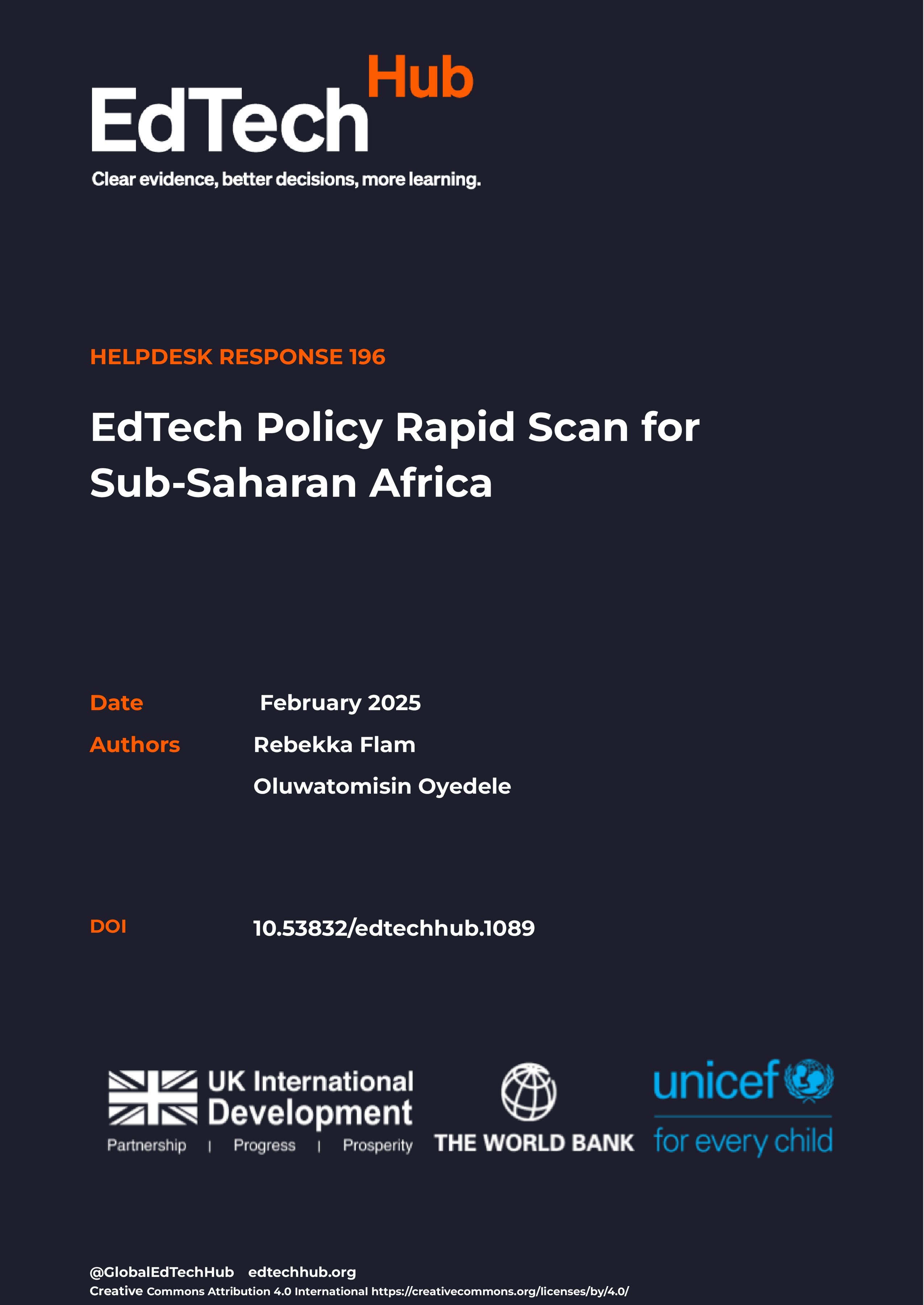 This rapid scan presents a curated list of EdTech policies in sub-Saharan Africa, compiled in response to a request from the World Bank. Based on desk research from mid-2024, it highlights that most policies predate COVID-19, with few new ones emerging post-2020. Many countries lack dedicated EdTech policies, instead relying on broader ICT or education strategies. Common themes include digital infrastructure, distance learning, and teacher training, while gaps remain in support for marginalised learners. The report provides an overview of existing policies, while the highlighted trends offer insights for future policy development. Keywords: EdTech policy; education policy; sub-Saharan Africa; EdTech governance; digital learning; digital infrastructure An output of the EdTech Hub, https://edtechhub.org/