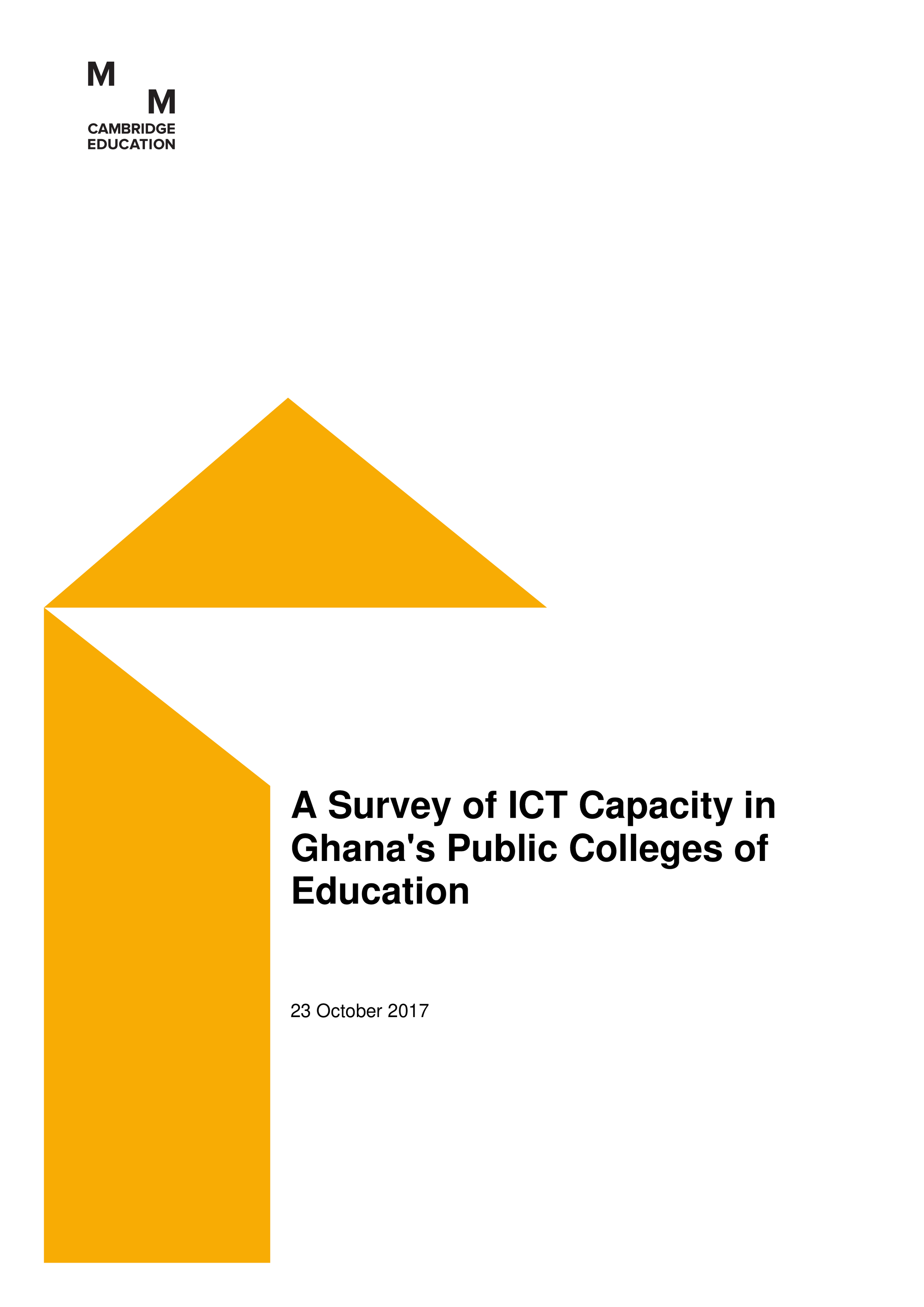 The survey of ICT capacity at 40 colleges of education (CoEs) reflects a considerable amount of work, by many people. The National Council for Tertiary Education (NCTE) acknowledges with thanks, Consumer Insights Consult (CiC) research team, Cyprian Ekor, Elvis Akpabli, Emmanuel Mireku, George Asare, Kennedy Amedume, Daniel Amewuda, Philemon Opoku. NCTE staff, Jacob T. Akunor, Anthony Dzidzornu, Emmanuel Attey Yebuah, Ebenezer Osei Adu, Nicholas Ameyaw and Kwaku Gyampoh. Transforming Teaching and Learning in Ghana (T-TEL) staff, Dr. Björn Haßler, Dr. Rosie Lugg, Mr. Charlie Gordon, Ms. Beryl Opong-Agyei, Dr. Rich Tobin and Ms. Caroline Jordan. Particular thanks is extended to Jacob Tetteh Akunor, who led this exercise on behalf of the NCTE and to the Senior managers, ICT tutors, ICT technicians and student teacher participants at all 40 CoE that participated, and gave so generously of their time and expertise.