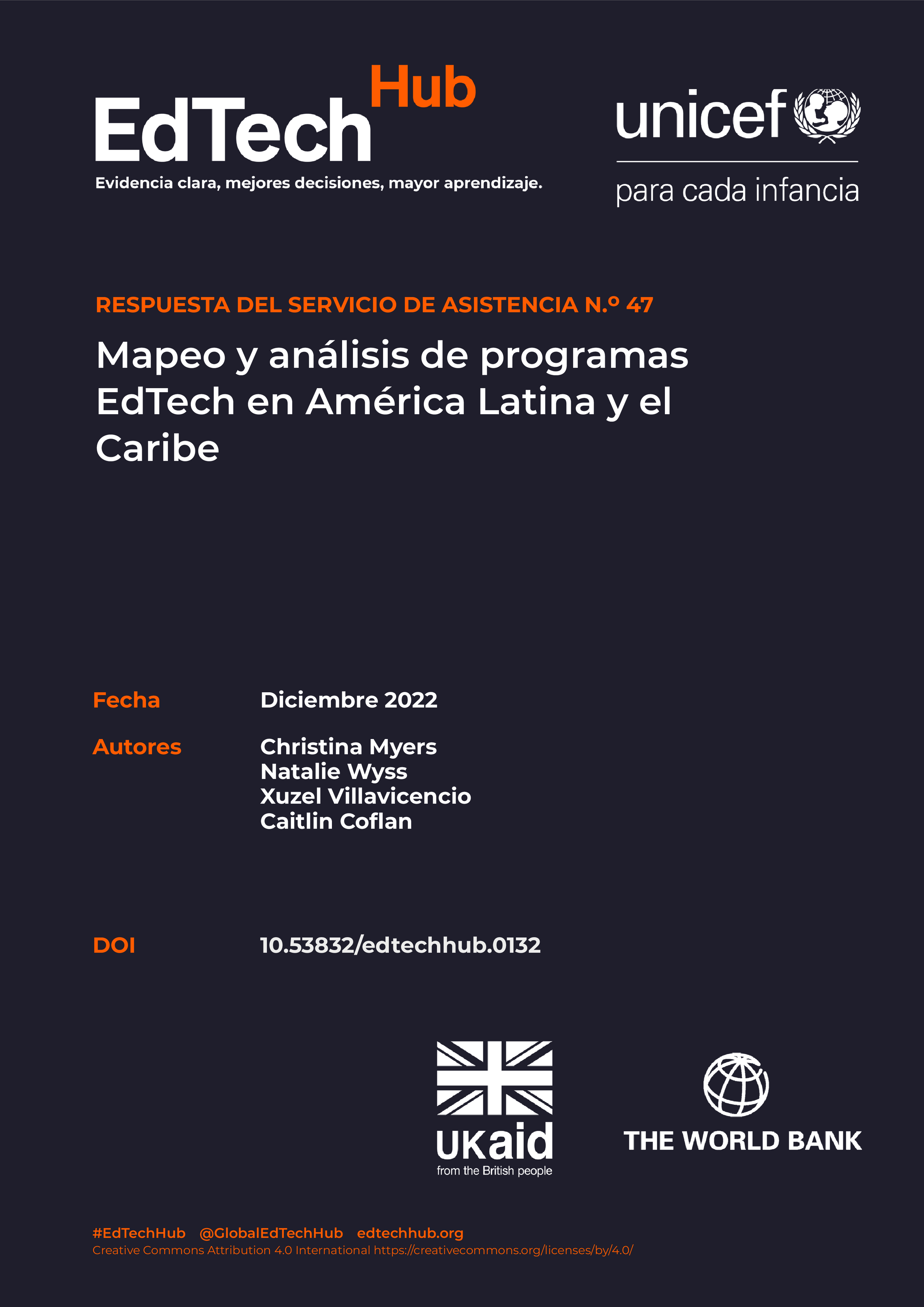 Este documento se elaboró en respuesta a una solicitud de la Oficina Regional de UNICEF para América Latina y el Caribe al Servicio de Asistencia de EdTech Hub en octubre de 2021. El equipo de UNICEF solicitó una lista seleccionada de programas de EdTech en la región de América Latina y el Caribe (ALC) y un análisis de un conjunto de programas preseleccionados con la intención de explorar su potencial para la implementación y el impacto a escala. Este informe no pretende cubrir todos los programas EdTech innovadores en la región de ALC. Más bien, presenta una lista de programas EdTech prometedores y analiza su diseño e implementación con el fin de explorar su relevancia y potencial para lograr un impacto a gran escala. An output of the EdTech Hub, https://edtechhub.org
